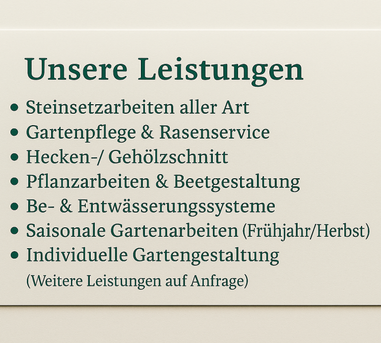 Wir sind stolz darauf, durch qualitativ hochwertige Arbeit und Leidenschaft für die Natur unvergessliche Gartenlandschaften zu schaffen.